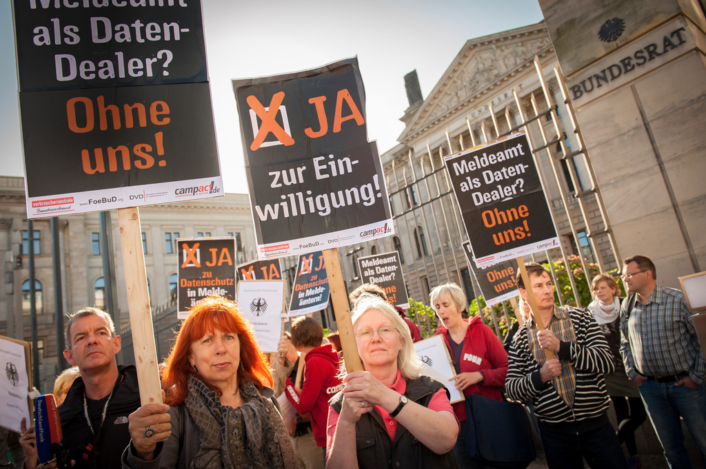 Breitner sagte, das Ziel aller Länder sei eine Einwilligungslösung. Demnach müssten Bürger ausdrücklich zustimmen, bevor Meldeämter ihre Daten etwa an Firmen weitergeben. Nach den bisherigen Gesetzesplänen wäre dies auch ohne Einwilligung der Bürger möglich.Vor dem Bundesrat demonstrierte das Bündnis “Meine Daten sind keine Ware” aus Campact, FoeBuD, VZBV und DVD. Sie übergaben mehr als 190.000 Unterschriften gegen das neue Meldegesetz an die Innenministerien der Bundesländer: